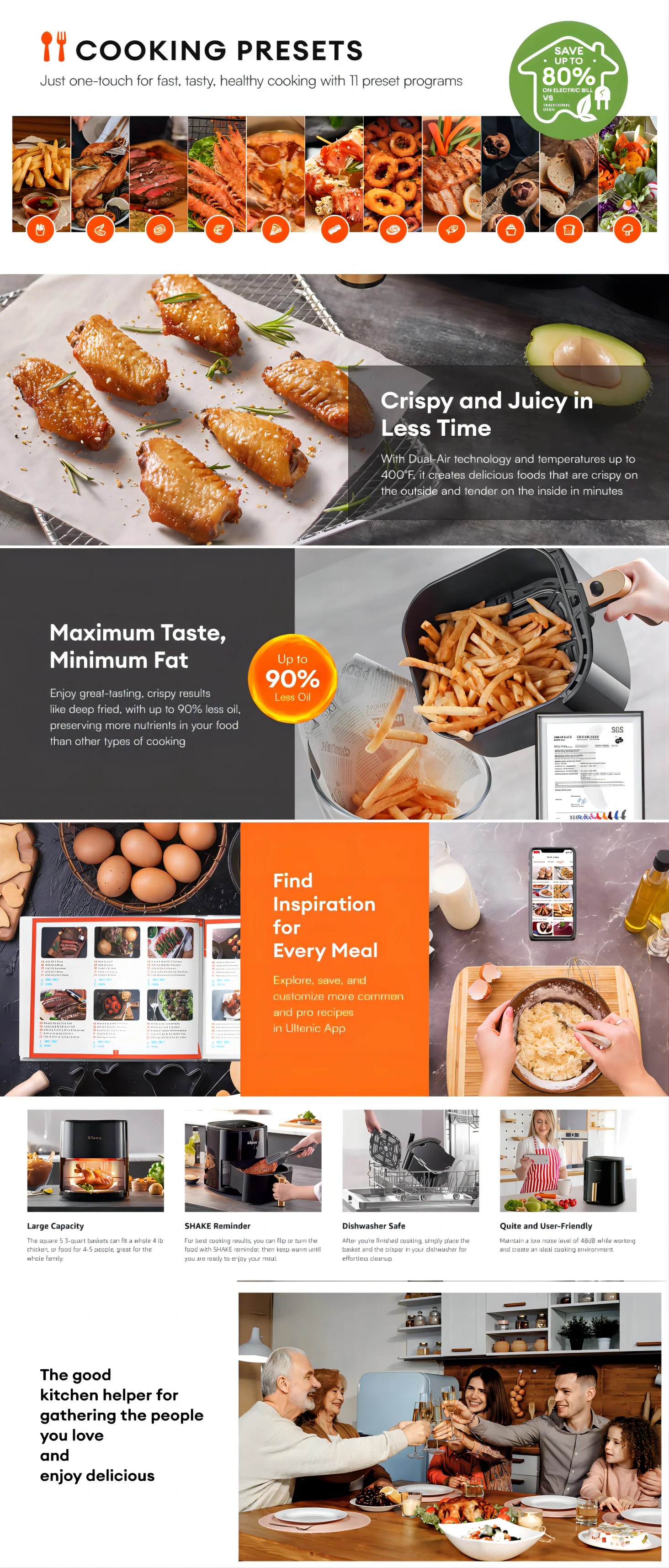 • Faster, Healthier, and More Delicious Food: Ultenic K10 Air Fryer's Dual-Air Technology allows for faster cooking times and up to 90% less oil usage, providing you with healthier meals that are still delicious and crispy