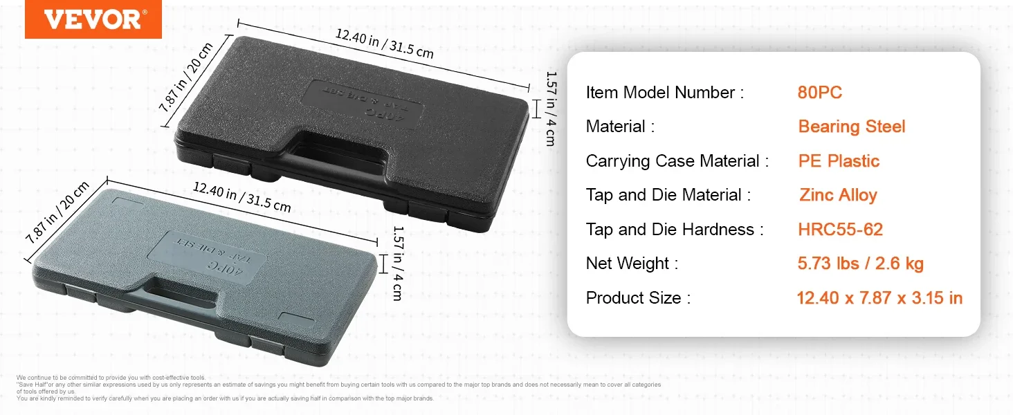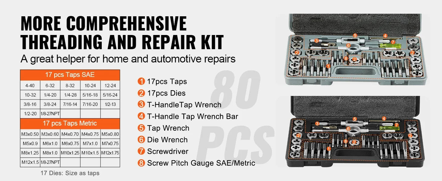 A professional 80-piece set of SAE&Metric taps and dies, including various sizes of 34 pcs dies, 34 pcs taps, 2 x die handle, 2 x tap wrench, 2 x T-type tap wrench, 2 x screw pitch gauge, and 2 x screwdriver, assisting you in efficiently completing thread-cutting tasks.