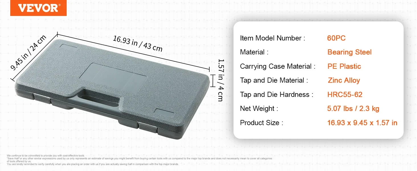 A professional 60-piece set of SAE&Metric taps and dies, including various sizes of 27 pcs dies, 27 pcs taps, 1 x die wrench, 1 x tap wrench, 1 x T-type tap wrench, 2 x screw pitch gauge, and 1 x screwdriver, assisting you in efficiently completing thread-cutting tasks.